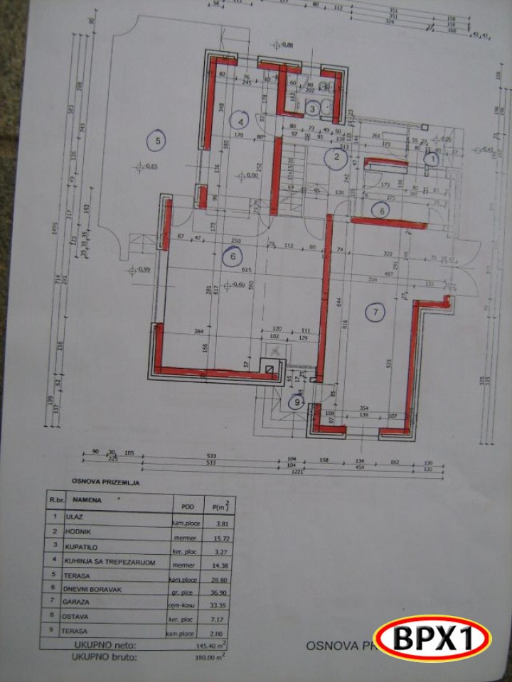 Pr: Bruto GRP 180 m2, neto GRP 145.40 m2. Ima ulaz, hodnik, kupatilo, kuhinju sa trepezarijom, veliku terasu, dnevni boravak, garažu, ostavu i malu terasu.